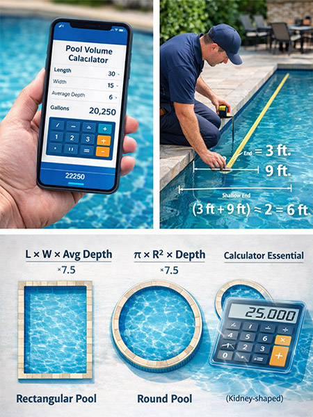 Professional pool technicians calculate volume using measured averages rather than guesses. This includes:
