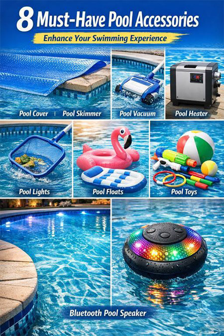 Essential pool accessories include a pool cover, skimmer, vacuum, heater, lighting, floats, toys, and a waterproof Bluetooth speaker. These improve cleanliness, safety, comfort, and enjoyment.