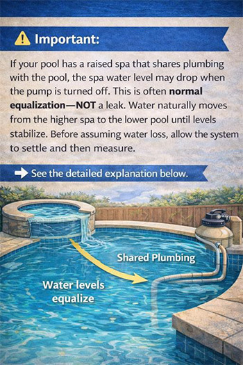If your pool has an attached spa that sits higher than the pool and both bodies of water share suction and/or return plumbing, water level behavior can look misleading during a leak test.