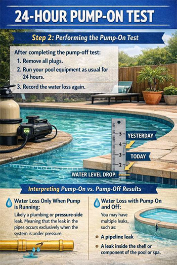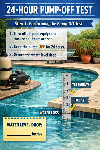 To assess water loss, you’ll need to conduct two separate 24-hour tests: one with the pump off and one with the pump on.
