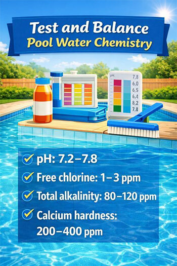 3. Test and balance water chemistry — Adjust pH, chlorine, alkalinity, and hardness for safe, clear water.