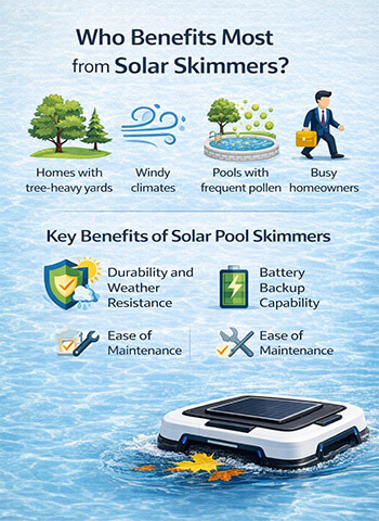 ⚠ Solar skimmers are not a replacement for full pool cleaning — they handle surface debris, not floor cleaning or filtration. Think of them as a preventive maintenance tool rather than a complete cleaning system.