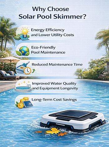 Solar pool skimmers are automatic, solar-powered robots that remove floating debris from swimming pools — reducing manual cleaning, lowering pump runtime, and improving water quality.