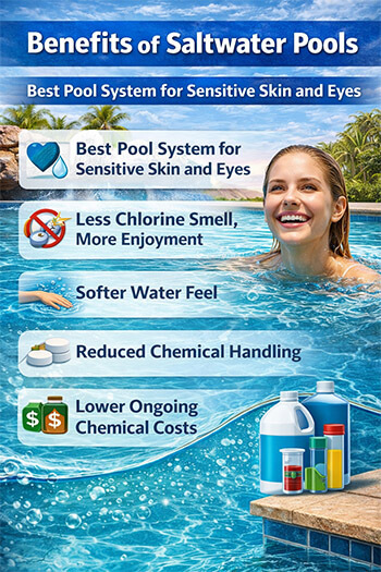 ● Saltwater pools are widely seen as the best pool system for sensitive skin thanks to gentler water and more consistent chlorine.
