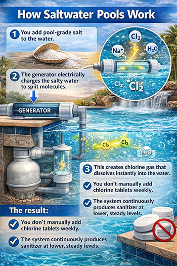 Saltwater pools use a salt chlorine generator (also called a salt system or salt cell) to convert dissolved salt into pure chlorine through electrolysis.