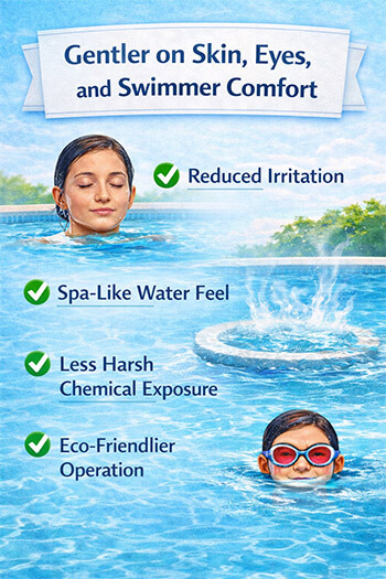 Lower, consistent chlorine levels reduce irritation to skin, eyes, and hair, creating a smoother swimming experience.