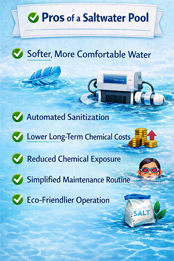 When properly balanced, saltwater systems are safe for modern pool components. Problems typically occur only if water chemistry is neglected or incompatible materials are used.