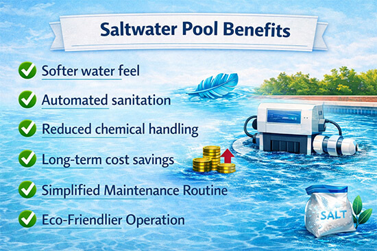 Saltwater systems use fewer consumables and generate less chemical waste compared to traditional chlorine pools.